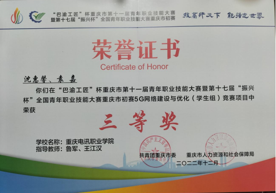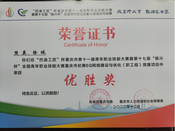 2022年,我校组织师生参加“巴渝工匠”杯重庆市第十一届青年职业技能大赛暨第十七届“振兴杯”全国青年职业技能大赛,并在重庆市初赛中分别获得学生组小组三等奖,学生组优胜奖,职工组优胜奖的优异成绩。