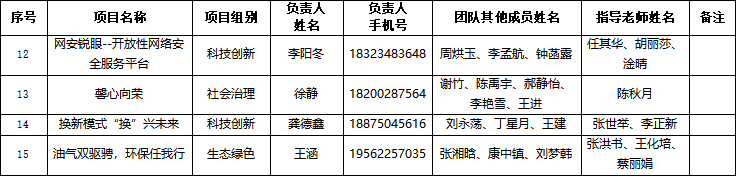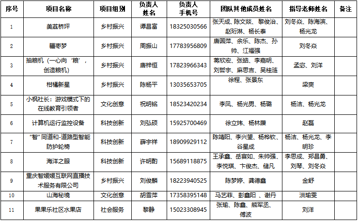 为深学笃行习近平新时代中国特色社会主义思想,深入学习贯彻习近平总书记关于青年工作的重要思想,引导和激励广大青年学子通过广泛的社会实践、深入的社会观察,不断增强对国情社情民情的了解,激发创新精神、培育创业意识、提升创业能力,按照《关于举办第十四届“挑战杯”中国大学生创业计划竞赛的预通知》要求,我校通过校级评选赛,经审核,拟推报以下15个项目参加市级选拔赛,现公示如下: