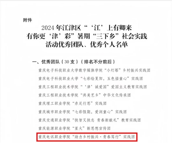为深学笃行习近平总书记关于青年工作的重要思想,发挥大学生在美丽乡村建设中的重要作用,促使广大青年学生在社会课堂中“受教育、长才干、作贡献”,江津共青团对“‘江’上有卿来 有你更‘津’彩”2024年暑期“三下乡”大学生社会实践区县专项中的优秀团队和个人进行表彰公示。其中,我校“助力乡村振兴 •青春笃行”实践团获评优秀团队,大数据与数字媒体学院邓鸿佳同学获评优秀个人。