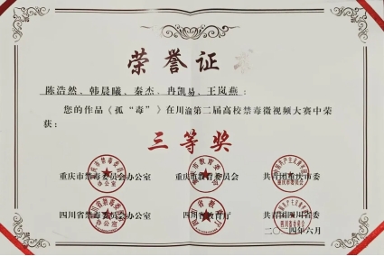 大赛秉承公平公正公开的原则,经高校推荐、组委会初评、专家终审三个阶段,我校学子陈浩然、韩晨曦、秦杰、冉凯易、王岚燕在众多参赛者中脱颖而出,荣获川渝第二届高校禁毒微视频大赛三等奖。