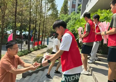 当老师们陆续走来,志愿者们立刻迎上前去,脸上洋溢着灿烂的笑容,将鲜花递到老师们手中,并送上最诚挚的节日祝福:“老师,您辛苦了!祝您节日快乐!”那一声声祝福,如同美妙的音符,在空气中回荡,温暖着每一位老师的心。