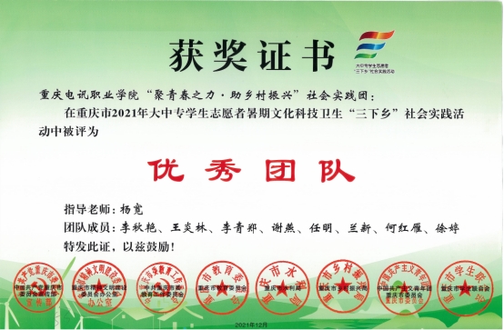 在本次“三下乡”志愿服务实践活动中,“聚青春之力·助乡村振兴”乡村振兴实践团在重庆市2021年大中专学生志愿者暑期文化科技卫生“三下乡”社会实践活动中被评为“优秀团队”,李秋艳同学在重庆市2021年大中专学生志愿者暑期文化科技卫生“三下乡”社会实践活动中被评为“优秀个人”。
