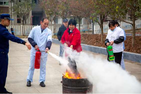 随后,志愿者配合消防员组织开展了消防演练活动。在演练中,模拟了火灾发生的场景,手把手教学“提、拉、拔、压”四步骤指导正确使用灭火器,并教授了正确的疏散逃生方法,