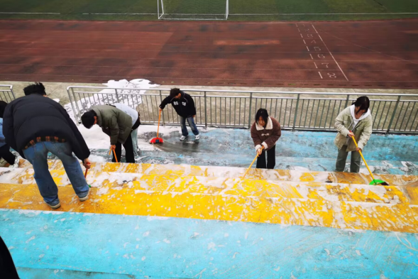 活动中,志愿者们分别拿着扫帚、刷子和塑胶桶等卫生工具,组织者进行分组在有组织有纪律的情况下一起打扫足球场的主席台,大家以劳动为荣,有的用扫帚清扫、有的蹲下用刷子刷地、有的用清水泼撒地面,用行动践行雷锋精神。经过长达半天的努力,体育场观众席座位、足球场环境的面貌焕然一新。